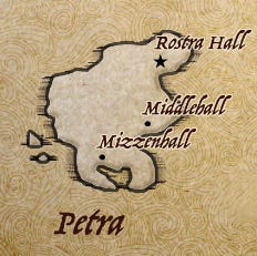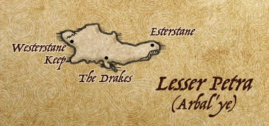 Nym, our main character, comes from the neighboring island of Lesser Petra. Now, Lesser Petra was conquered by Petra centuries before our story. Before that, it was called Arbal’ye. But that name, together with the Arbal’yan language, religion, local customs, and anything that smacks of an Arbal’yan national identity, has been forbidden by the Petrans. Lesser Petra is a vassal state to her neighbor, reduced to nothing but a highly taxed agrarian economy. A Petran military governor rules Lesser Petra from the town of Westerstane Keep.