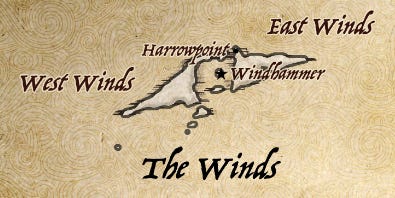 And The Winds, an island ruled by a theocracy which appoints its harald. It’s a bare, wind-blasted region, but the conditions have led its inhabitants to be regarded as the best sailors in the world.