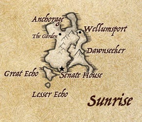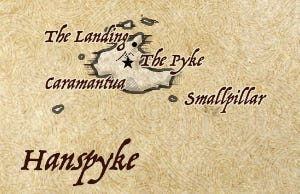 Moving on, well to the east of Lesser Petra is Hanspyke, a warm and wealthy land ruled by the Hansa family. It was on this island, at a place now called The Landing, where, 912 years before our story, a ship from the island of Sunrise first made contact with the people of another land. This cracks open one of the core mysteries of the Archipelago: humanity appears to have either emerged on various islands independently, or else they somehow arrived there at some unknown moment in their prehistory. No one knows for sure.