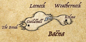 The last major island in the Archipelago proper is Baëna, home to many master craftsmen, and the only island hosting not one but two nations on a single piece of land. To the west is Weatherneck, to the east Leeneck. Both nations have mineral and timber wealth, and they share the largest lake in the known world, making Baëna the only island which produces large quantities of fish. These twin nations attempt neutrality, both with one another and with the larger political blocks.